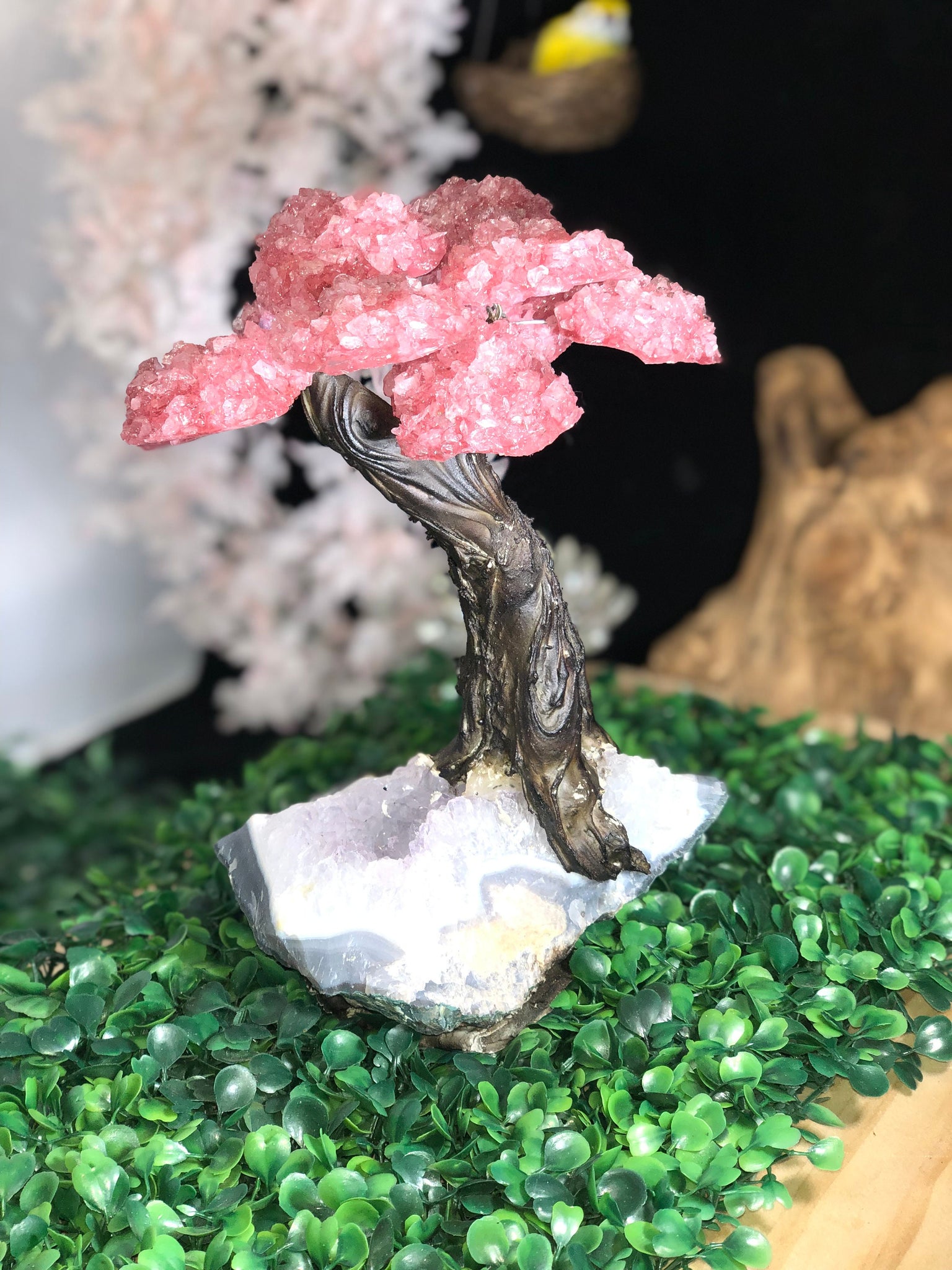 Small Handmade Brazilian Rose quartz clustered gemstone tree with a faux Bonsai tree trunk, set on a beautiful large grape purple Amethyst crystal cluster matrix. This tree makes a great gift and a beautiful item to display in any room.
